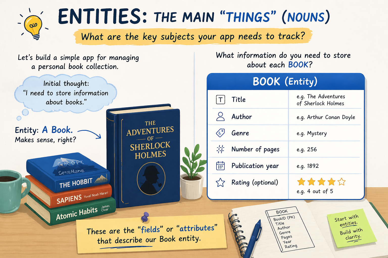 - List Your Nouns: Brainstorm all the key "things" your app will manage. These are your potential entities. (e.g.,