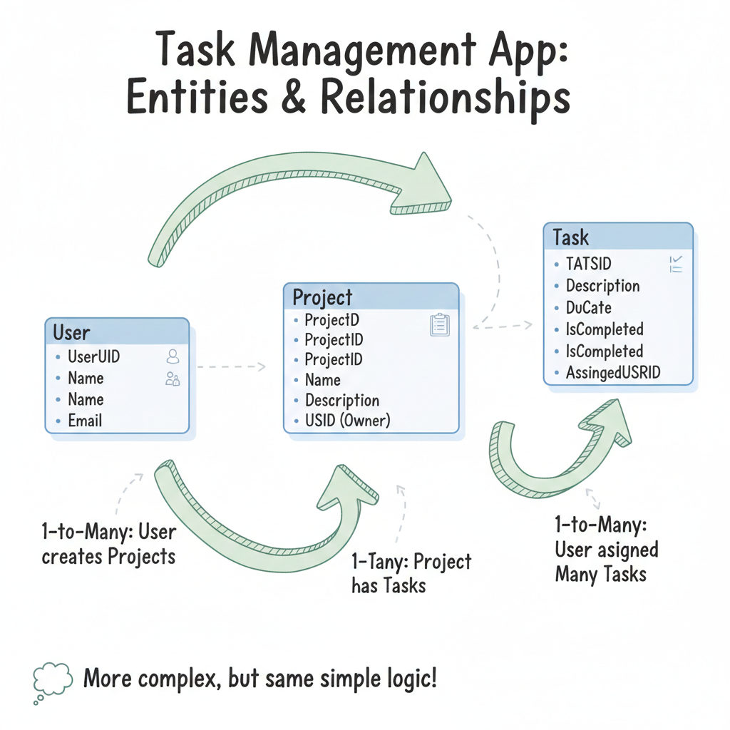One User can be assigned Many Tasks (1-to-Many: Task has AssignedUserID).