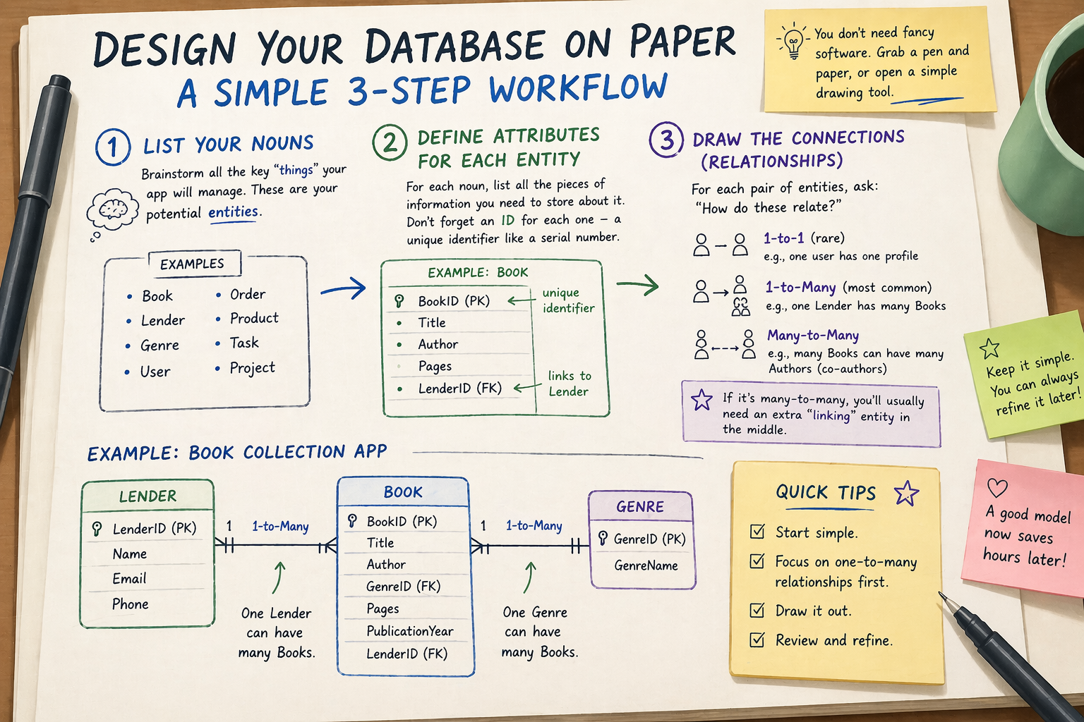 IDfor each one – a unique identifier like a serial number. (e.g.,Book:BookID,Title,Author,Pages,LenderID). - Draw the Connections (Relationships):