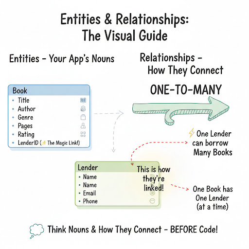- List Your Nouns: Brainstorm all the key "things" your app will manage. These are your potential entities. (e.g.,