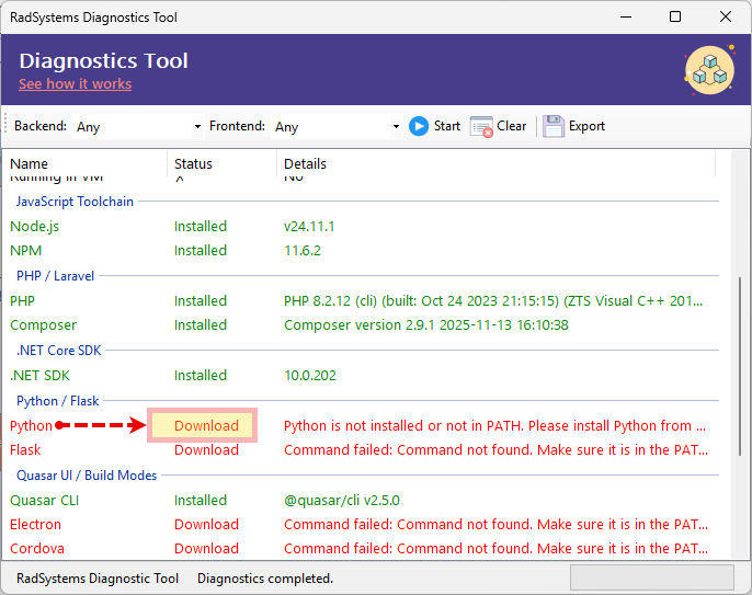 For any missing dependency, the tool provides a Download option. Clicking it takes you to the official source where you can obtain the correct version and install it manually.