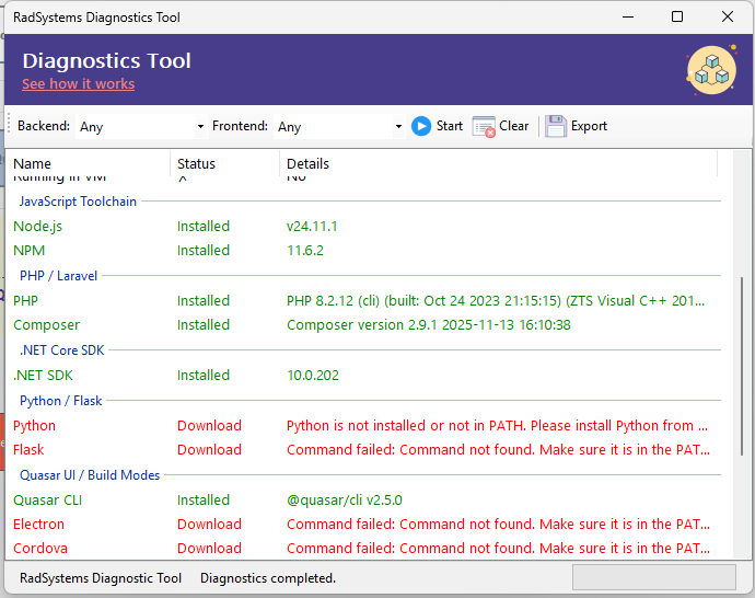 The Framework Diagnostics Tool in RadSystems Studio is designed to analyze your system’s readiness for development across supported frameworks.