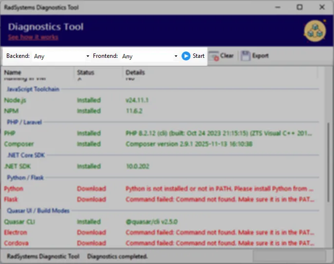 Every development stack requires its own ecosystem of dependencies to be installed locally before you can start building applications. RadSystems Studio does not bundle these dependencies by default. This approach helps prevent version conflicts and ensures that your existing development environment remains stable and unaffected.